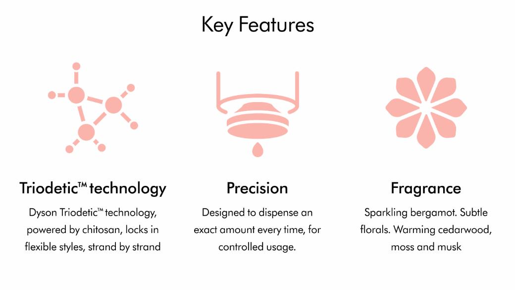 The Dyson Chitosan™ Post-style serum has been engineered for finished styles on all hair types so your strands feel moisturised, soft and smooth with 2x longer hold.1