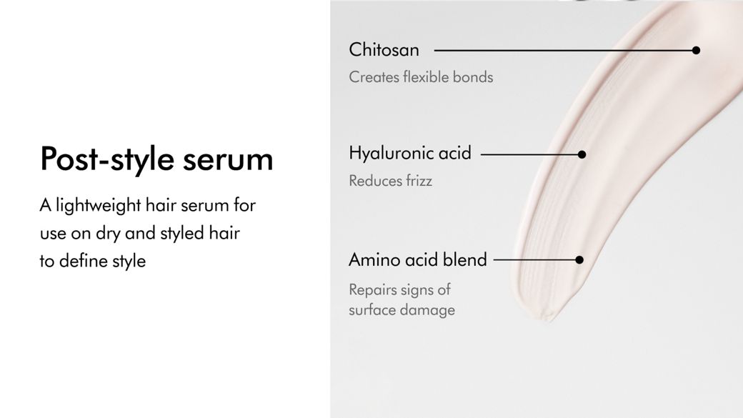 Dyson Chitosan™ Post-style serum should be applied on dry, styled hair. Work through your hair with your fingers to smooth, define and enhance your style.