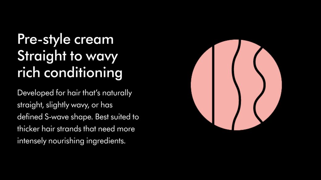 First, determine your hair shape. Our Pre-style cream is tailored to two groups of hair shapes: straight to wavy, and curly to coily. To find which applies to you, imagine your hair has been washed and left to air-dry. What shape do the majority of the strands take?