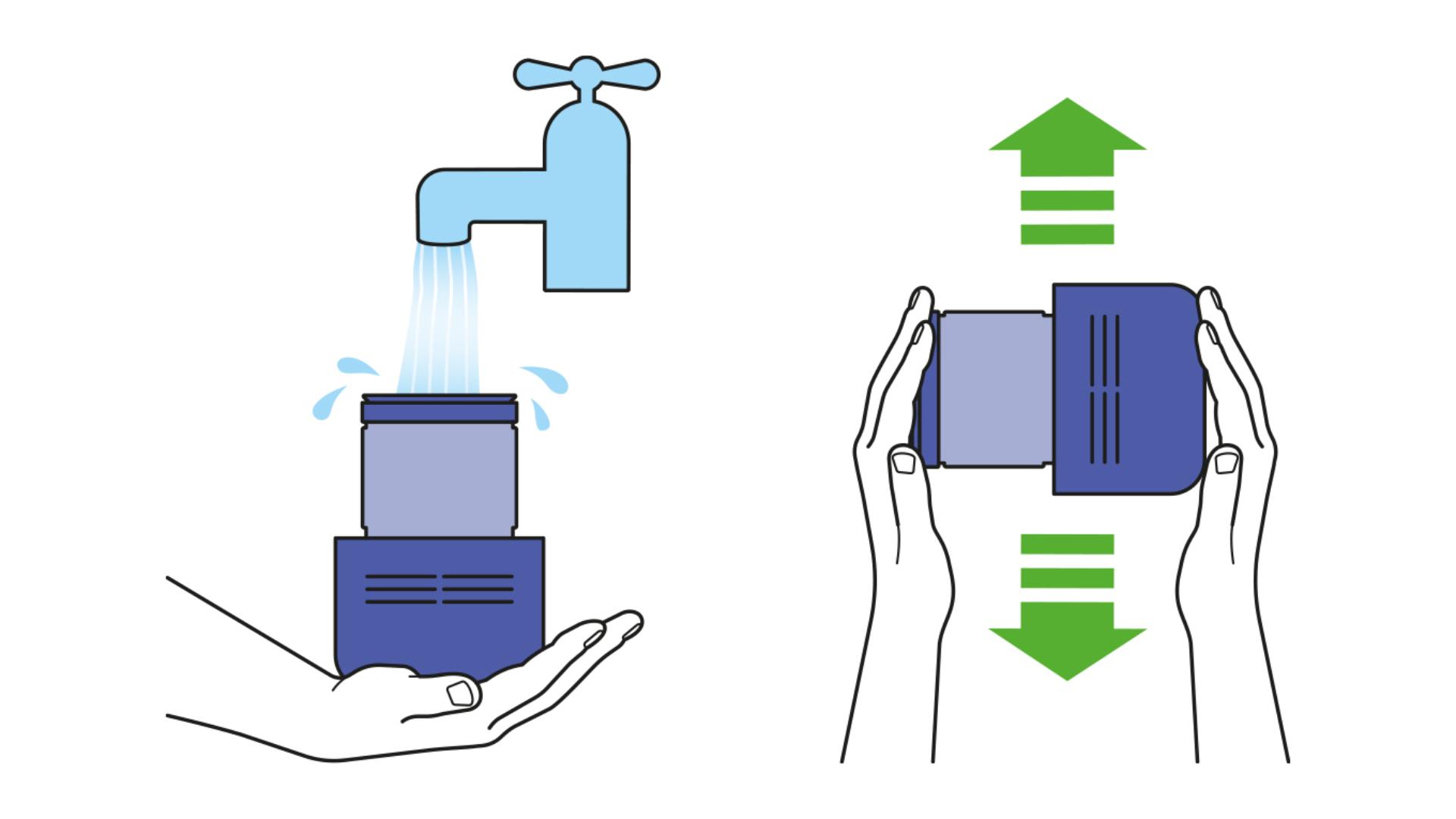 Fill your filter(s) with warm tap water. Cover the open ends with your hands and shake firmly to remove the dirt. Repeat until the water runs clear and then firmly shake the filter to remove all excess water. -