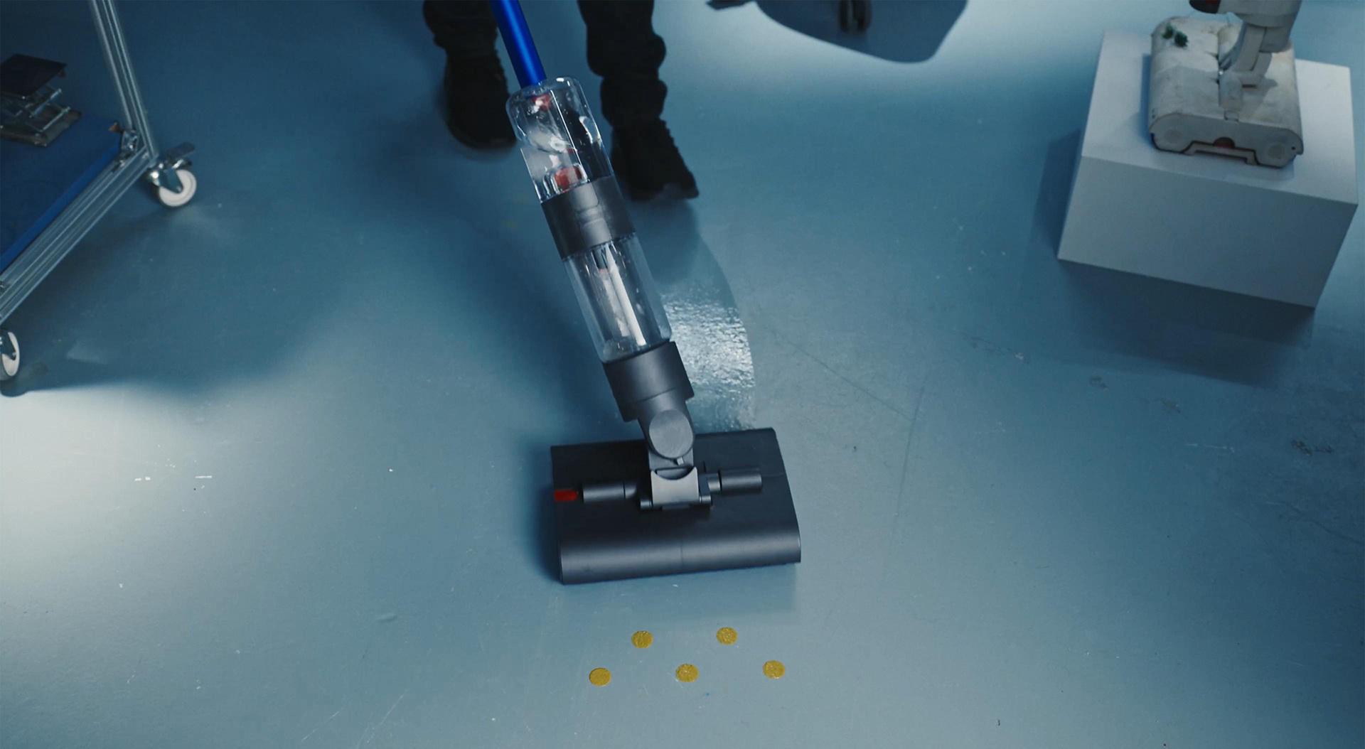 Single-roller wet washers can smear dirt, Dyson leaves floors stain-free.